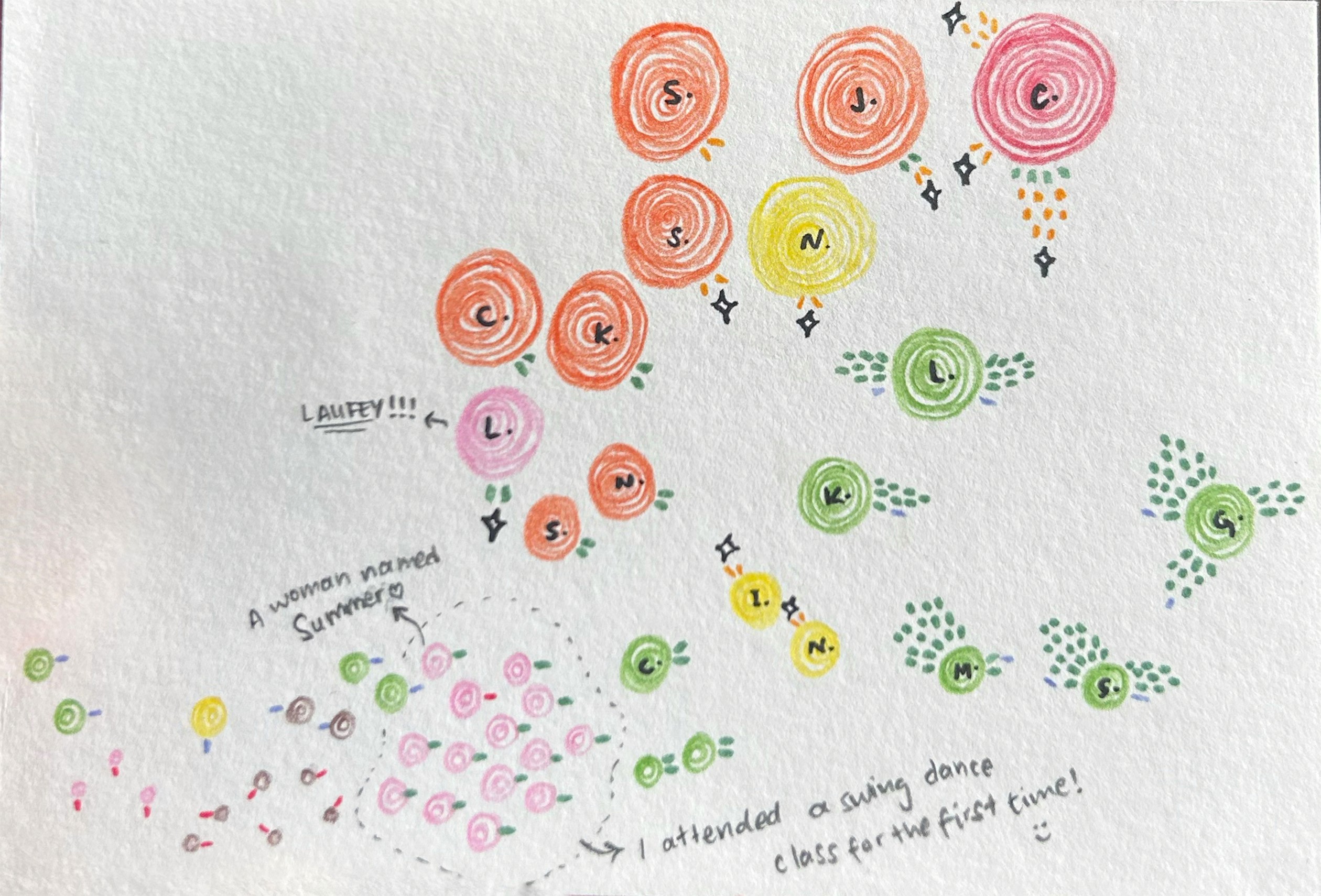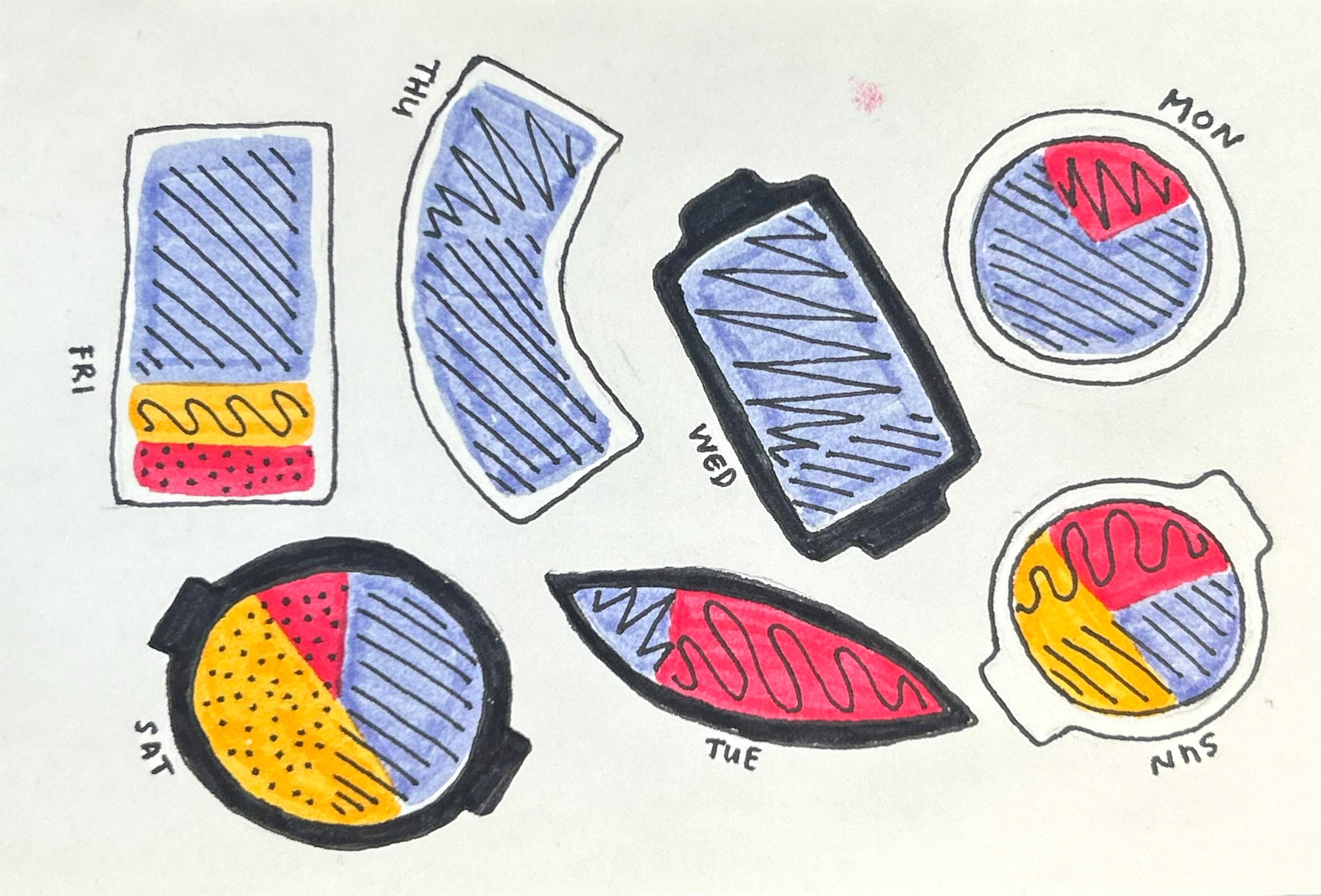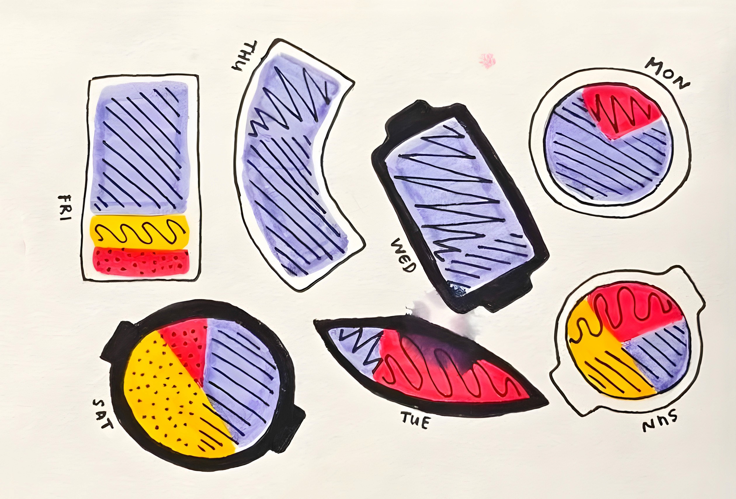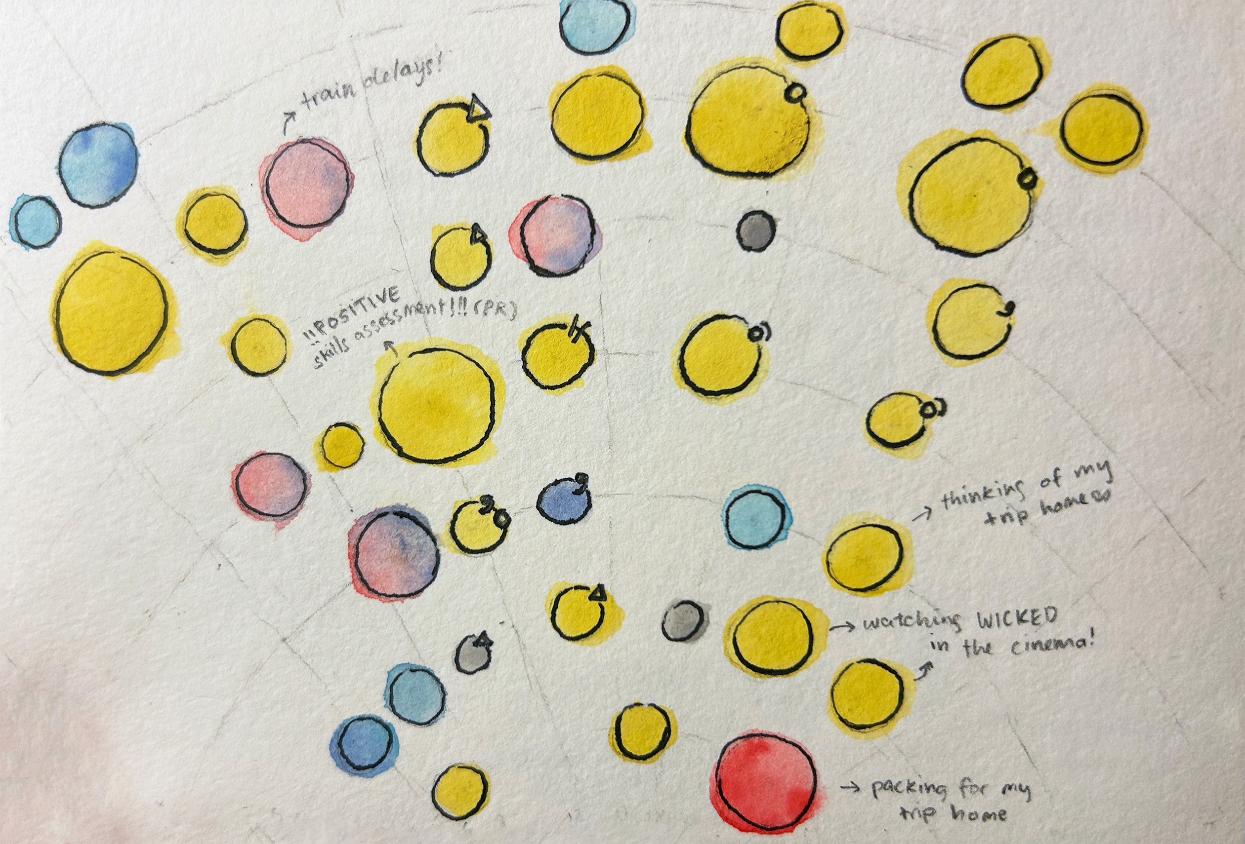 In 2024, after a coffee first-meet-up where we shared our love for all things data viz, we decided to embark on a 6-month long Dear Data friendship of our own! Like Giorgia and Stef, we tracked our lives' data from a week in each month (based on the month's theme), visualised the data by hand-drawing on A5 postcards, and sent it to each other, forming the start of a data-rich friendship! See our postcards below, and we hope you learn something new.